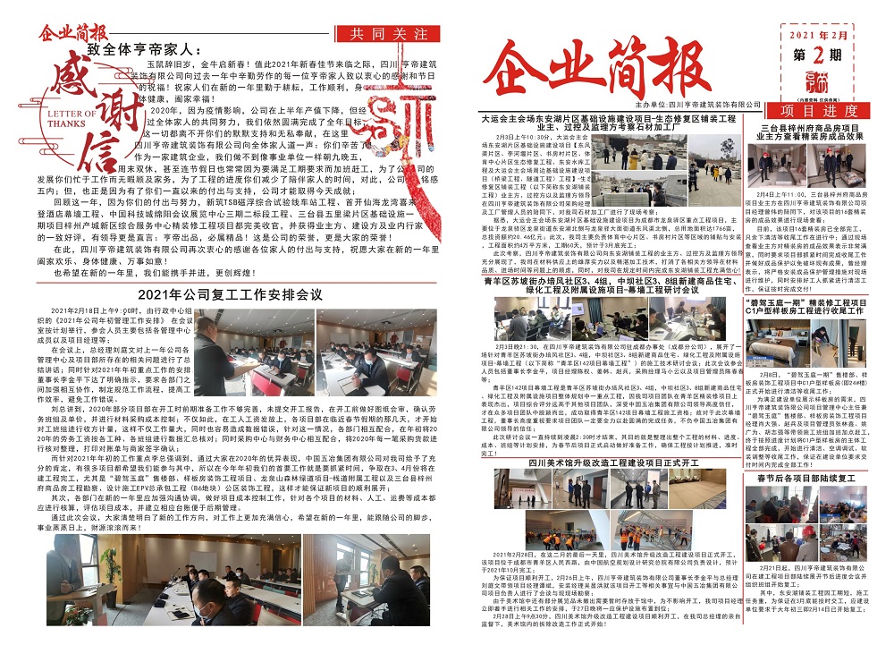 2021年公司第二期简版出来了,各位项目经理、项目管理员如有意在简报上发表自己的文章,如工程工艺、项目进度管理等相关稿件,可以直接将稿件发送到我的微信上,欢迎大家踊跃投稿哦!